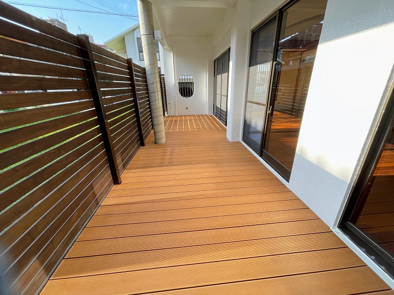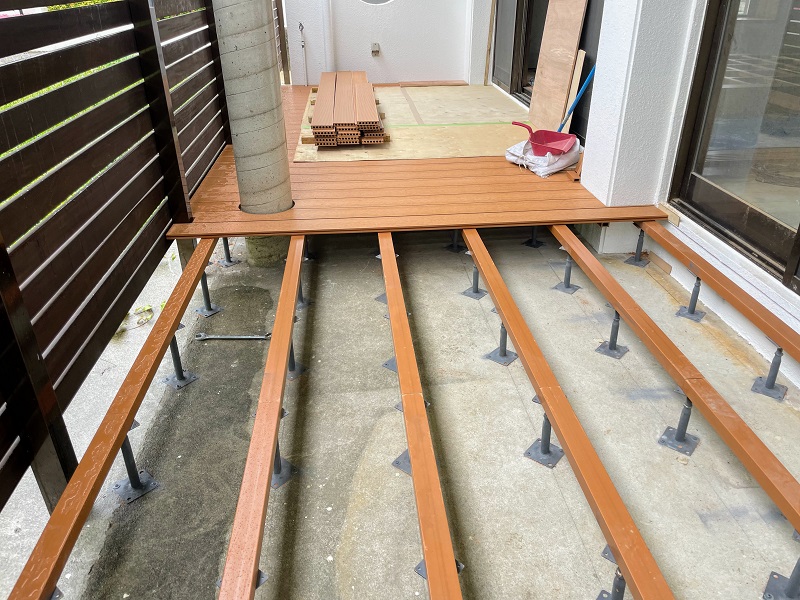 沖縄市の室内リフォームも伴う工事で人口ウッドデッキの施工を行いました。 金属制の束で下地の人口ウッド角材をビス止め高さ調整し、その上に仕上げの人口ウッドを専用の金具で固定します。